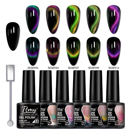 -6-Piece Gel Nail Polish Set –Double Light Reflective Disco Twinkle & Magnetic Cat Eye Gel, Sparkling Rainbow Finish-